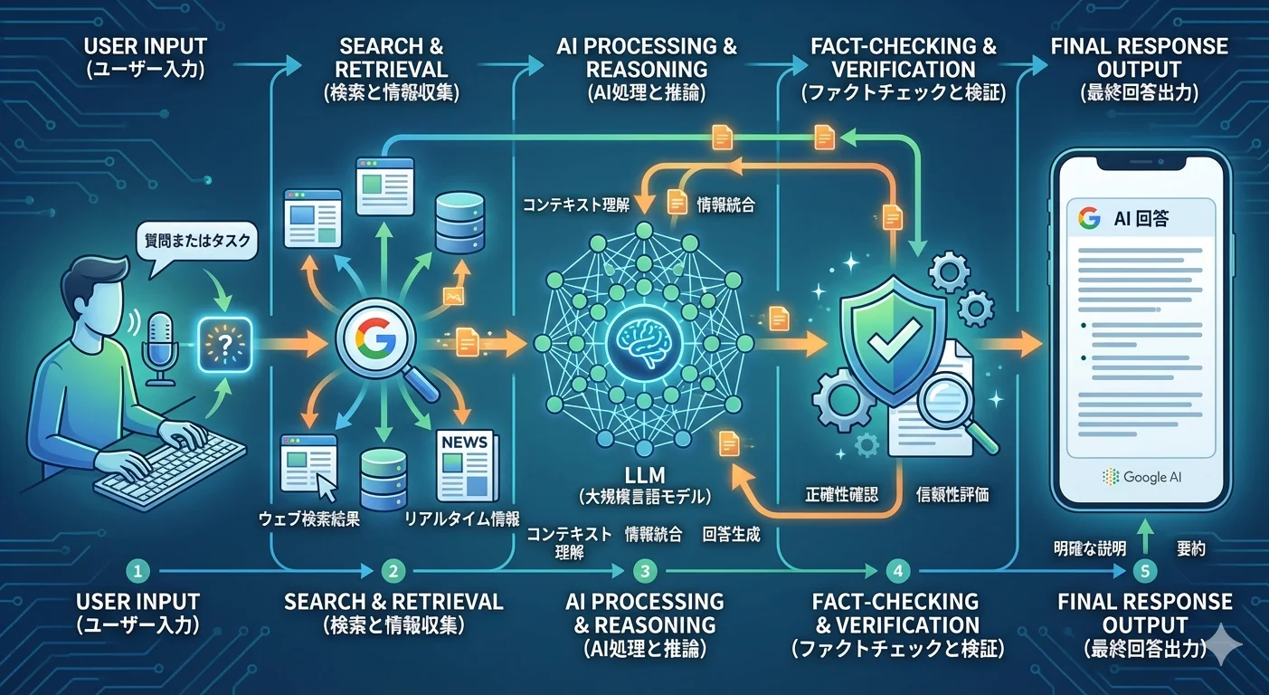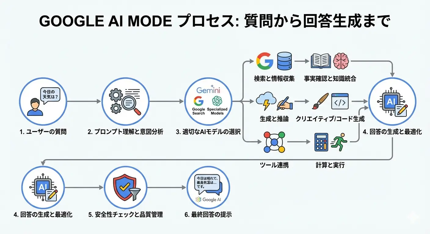 AI Mode が回答を生成するプロセスを解説するインフォグラフィックを、AI Mode の Nano Banan Pro で作ってみました。